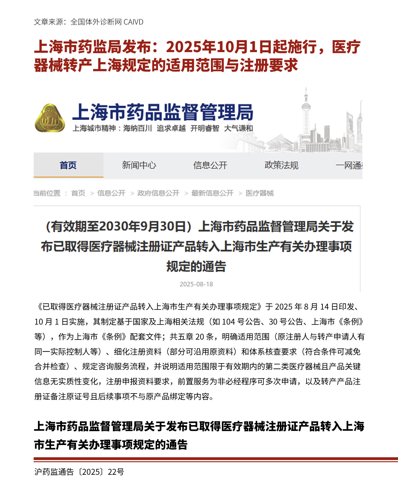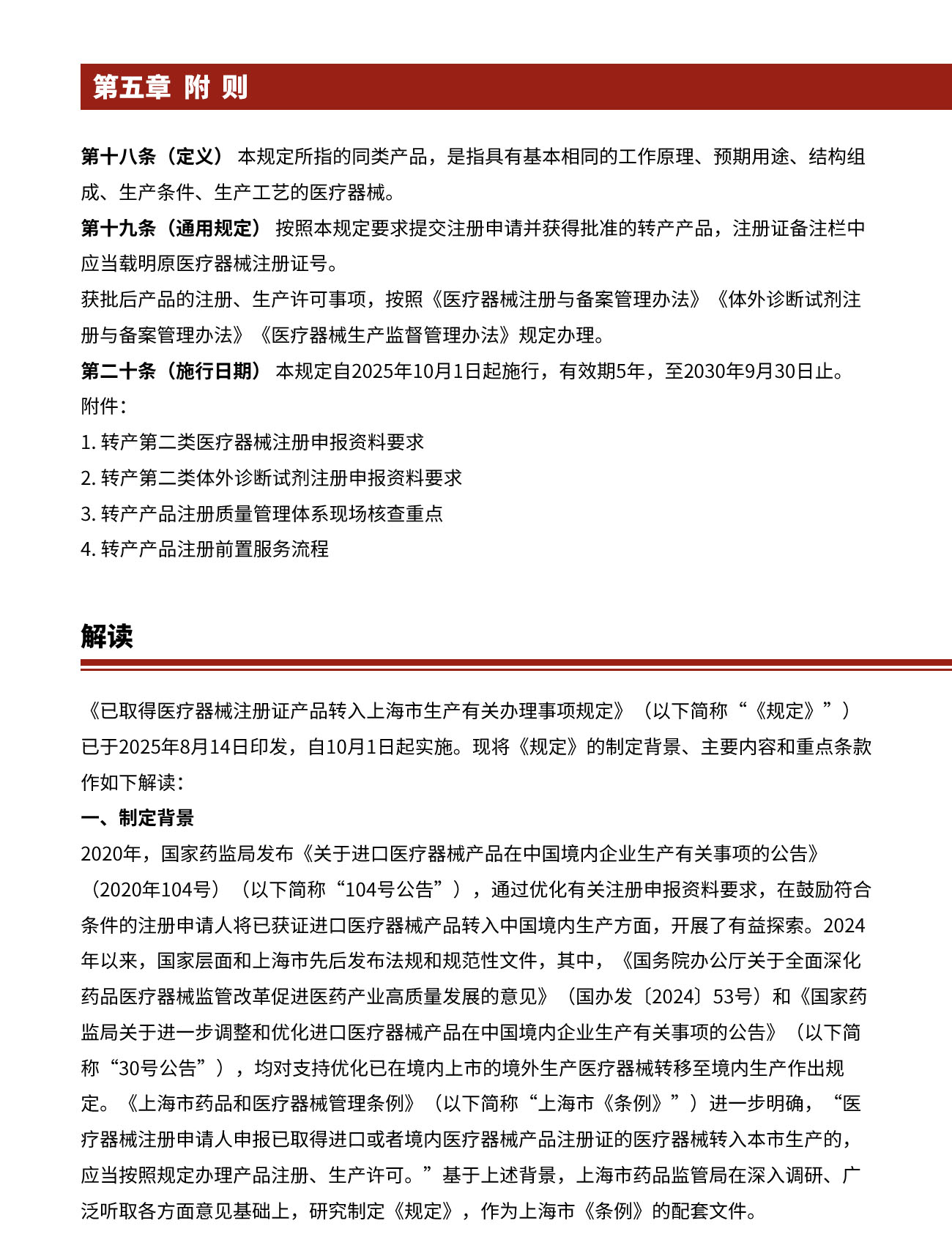 上海市药监局发布:2025年10月1日起施行,医疗器械转产上海规定的适用范围与注册要求