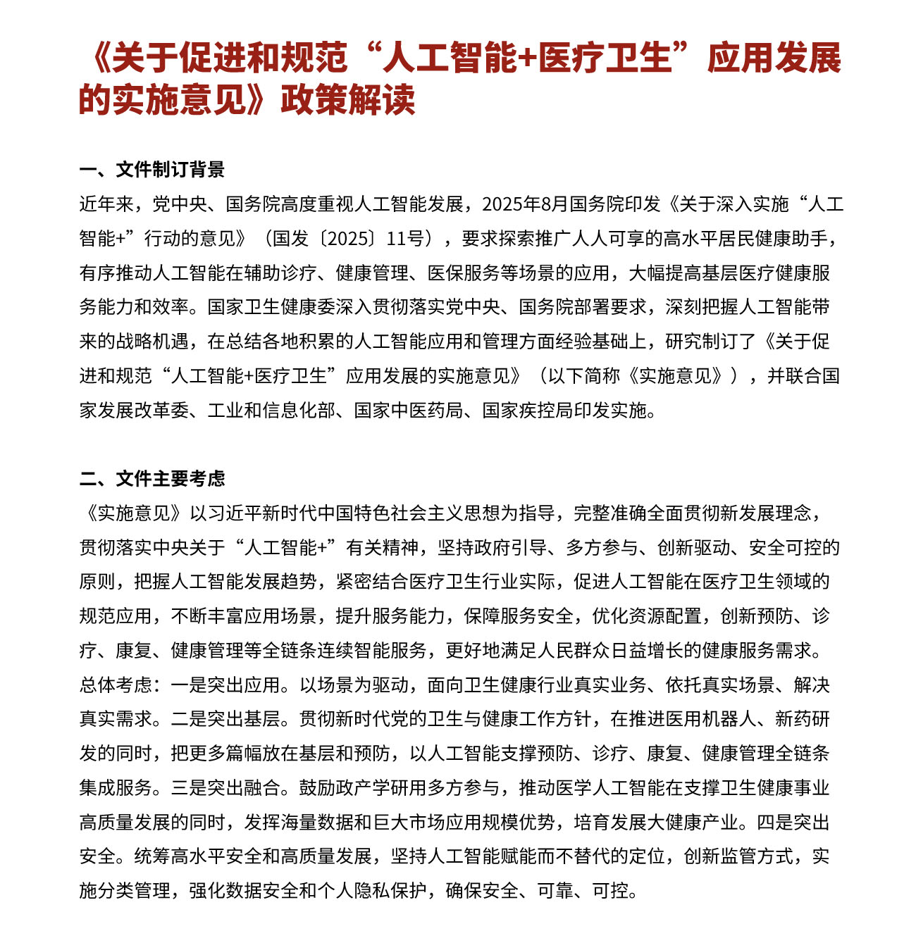 国家卫生健康委等五部门印发《关于促进和规范“人工智能+医疗卫生”应用发展的实施意见》(附解读)